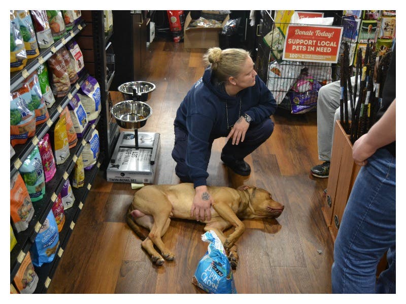Pictured, Baltimore Animal Control Officer Jess Novak crouches in a pet store with an injured stray dog that was brought in for care on March 29, 2016. Capital News Service photo by Leo Traub.