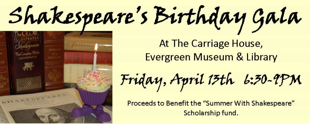 The Baltimore Shakespeare Factory (BSF) will host a Birthday Gala for William Shakespeare on Friday April 13th, 2012 at The Carriage House, Evergreen Museum & Library (6:30-9PM.) All proceeds from the event will benefit the BSF “Summer with Shakespeare” Scholarship Fund*.