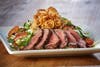 - Beef Tenderloin Salad – Marinated beef filet grilled to your liking atop fresh baby spinach tossed in warm bacon vinaigrette and topped with avocado, tomatoes, gorgonzola cheese, roasted pancetta and crispy onions.