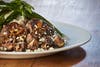 - Pepper-crusted Filet Medallions – Two marinated filet medallions grilled to your liking, smothered with roasted crimini mushrooms, caramelized onions, bleu cheese sauce and crumbled gorgonzola cheese. Served with roasted garlic mashed potatoes and grilled asparagus.