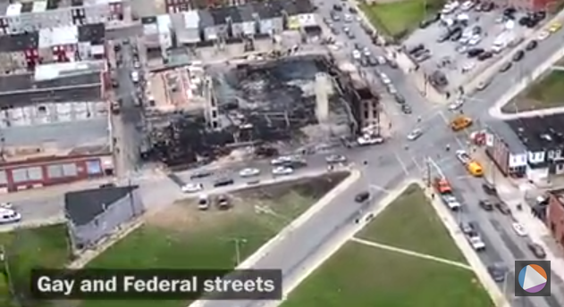 Screenshot of aerial showing where riots broke out, the day after from YouTube/Washington Post.