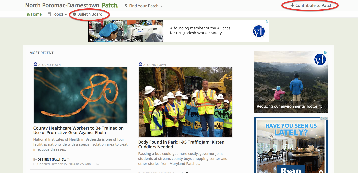 Two user-interaction opportunities are found on the home page of every Patch. They’re circled in red: “Bulletin Board” and “Contribute to Patch.” (Screenshot: Patch.com)