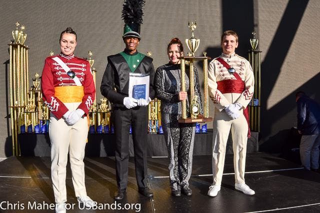 Photo: Arundel High School Drum Major Darius Burton and Color Guard Captain Ashlynn O’Donnell receive the certificate and trophy for 4th place in Group II Open from members of the Cadets Drum and Bugle Corps at the U.S. Bands National Championships at MetLife Stadium on Saturday, November 15, 2014