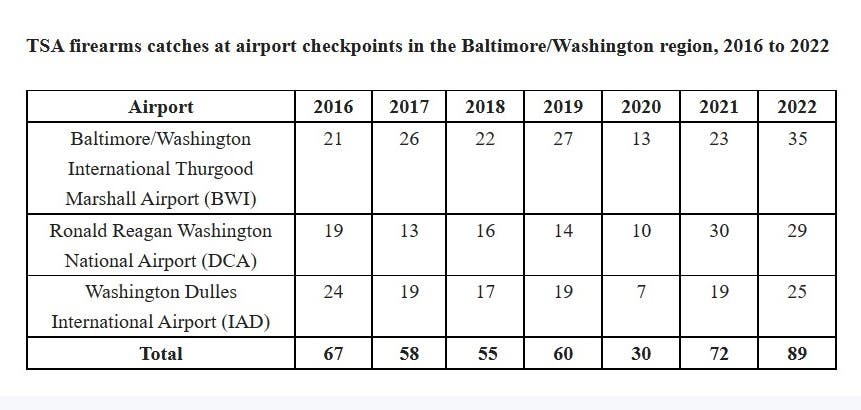 Officers caught a combined 89 handguns last year at the Baltimore-Washington area's three major airports. That's up nearly 24 percent from the 72 guns caught in 2021.