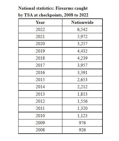 TSA caught 6,542 guns at airport security checkpoints nationwide in 2022. That was an increase from the 5,972 detected in 2021. Last year's total was also a spike from the 4,432 stopped in 2019 before the pandemic.