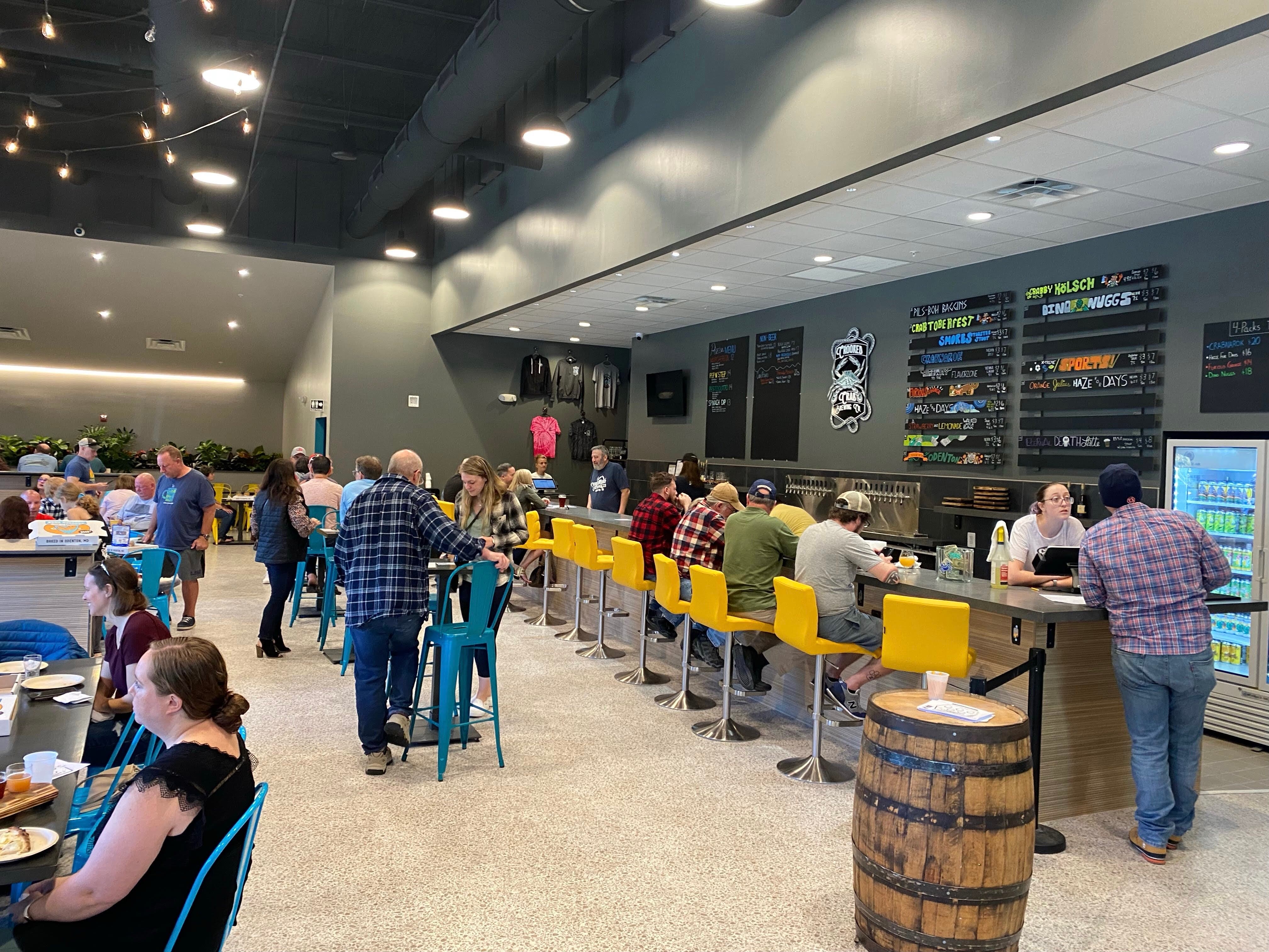 Crooked Crab first opened its 2,200-square-foot bar in 2018. Soaring windows in the original taproom overlook the brewhouse, which spans about 4,000 square feet.