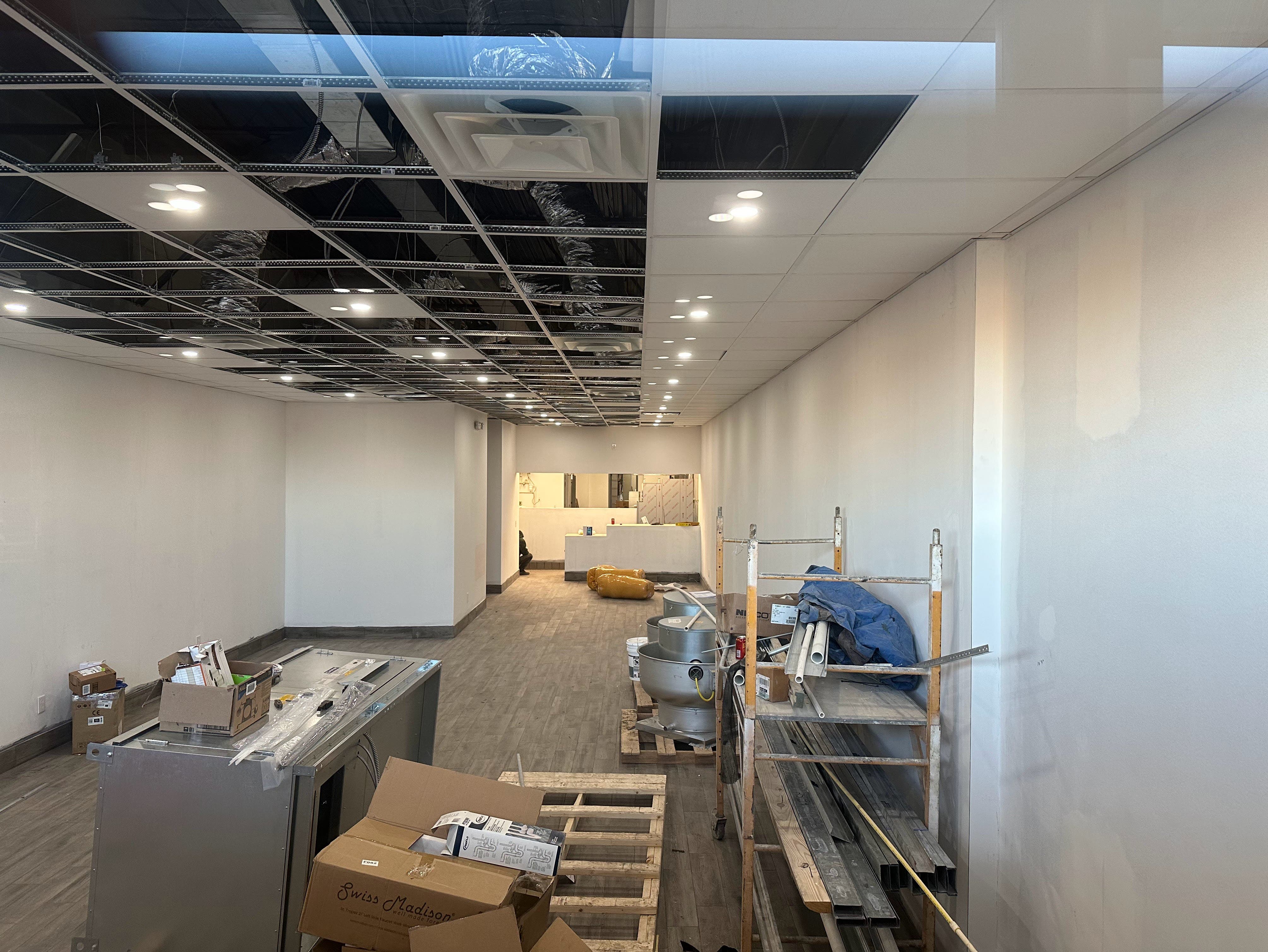 There were not yet any tables inside. Workers were still installing kitchen equipment.