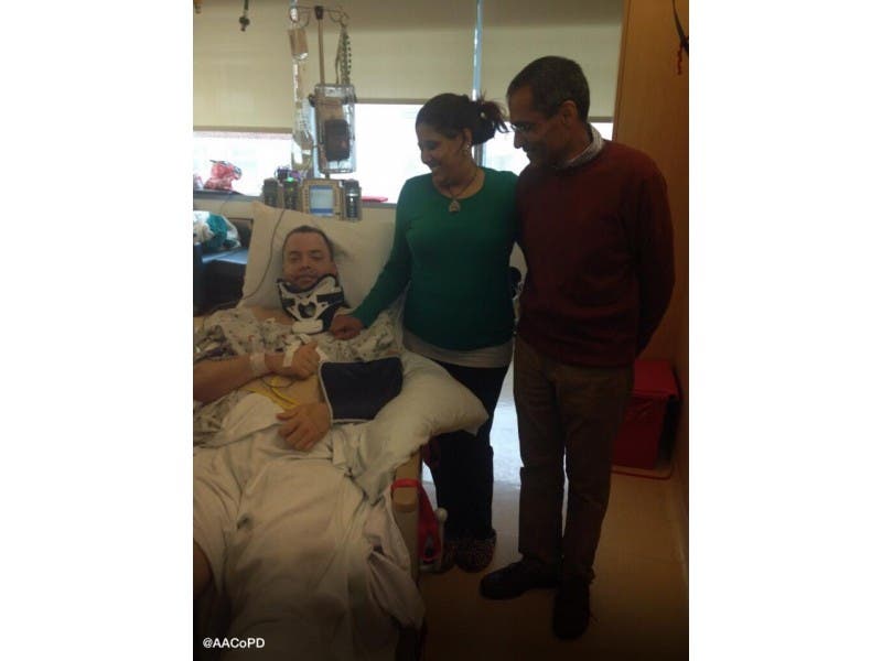 Corporal Larry Adams continues to recover at University of Maryland Shock Trauma in Baltimore and was shown with his wife, Ritu, and the owner of 7-Eleven, who stopped by to visit.