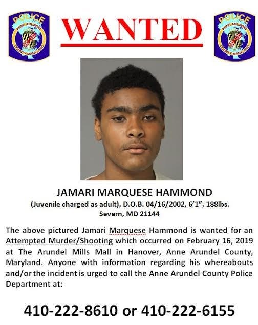 HANOVER, MD — Anne Arundel County Police have a 16-year-old Severn boy in custody who is accused of shooting a man at Arundel Mills Mall. Jamari Marquese Hammond was accompanied by his mother when he turned himself in at the Western District police station about 10:30 a.m. Tuesday on a charge of attempted murder, authorities said. Police had earlier released Hammond's photo and asked that anyone who knew of his location to call authorities.