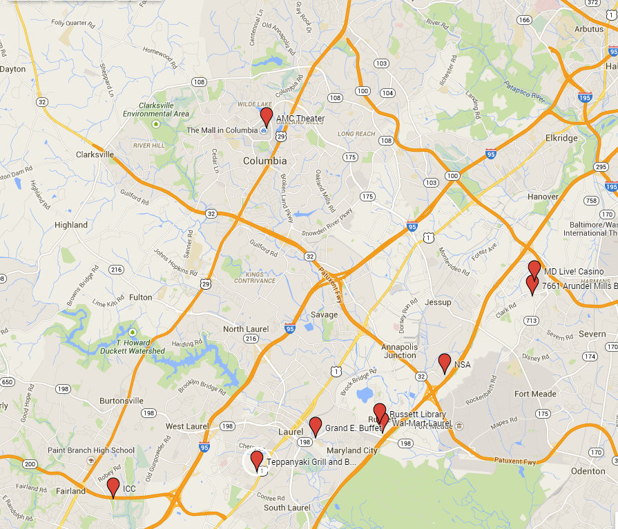 - Walmart, 3549 Russet Green East, in Laurel. Several shots were heard in the area of the parking lot closest to MD 198 and Russet Green East. No damage was found in the incident, reported at 2:50 a.m. on March 2.