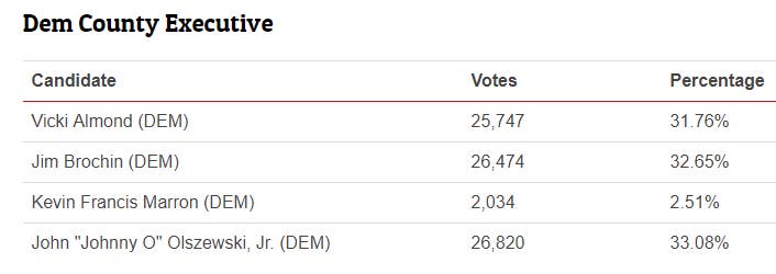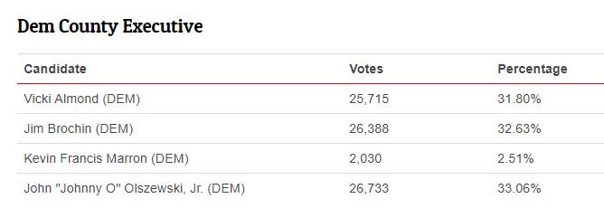 - John "Johnny O'" Olszewski Jr. had 33.08 percent of the votes.