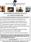 • Free pet adoptions at Baltimore Humane Society to all military (once approved by Pets for Patriots)