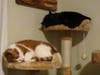 It's been about a month and a half since we brought Moe home, and he now spends most of his days either curled up on the top platform of the 7' cat tree, or sitting in the living room window, watching birds. When he wants pats, he makes very sure he gets them. When that happens, we must be prepared to use both hands, because he won't accept just one! His purr is like a little engine, and he absolutely LOVES head-scratches and tummy rubs (he'll get so ecstatic about tummy rubs that he actually drools). His astounding feats in the litter box have earned him the loving moniker "Poo Beast," and he and Ichiban entertain each other by playing tag around the house, galumphing up and down the stairs, and taking breaks to assist each other in losing whole clumps of winter hair (until we scold them and tell them to play nice).