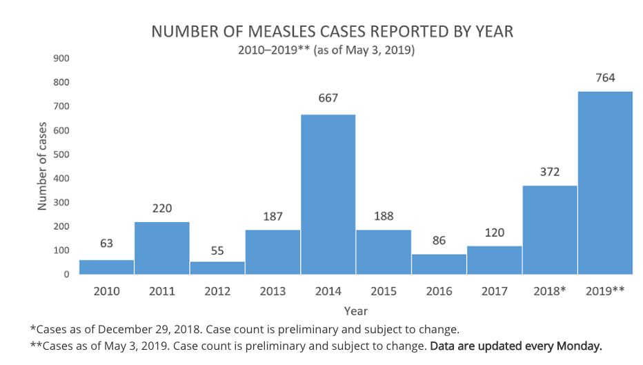 As of the latest update from the Centers for Disease Control and Prevention (CDC), there have been 764 cases of measles reported in the United States, and health officials expect more cases this year. The CDC says it is monitoring outbreaks in nine jurisdictions, including Maryland. It defines an outbreak as three or more cases.