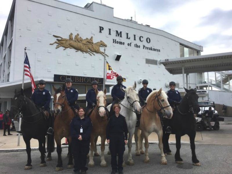 The Baltimore Police Department's mounted unit was at Pimlico on Thursday, May 19. Photo Credit: Baltimore Police.
