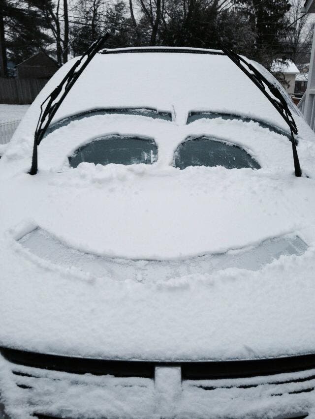 We asked for your wintry photos, and one person delivered—a big smile made out of snow on a car.