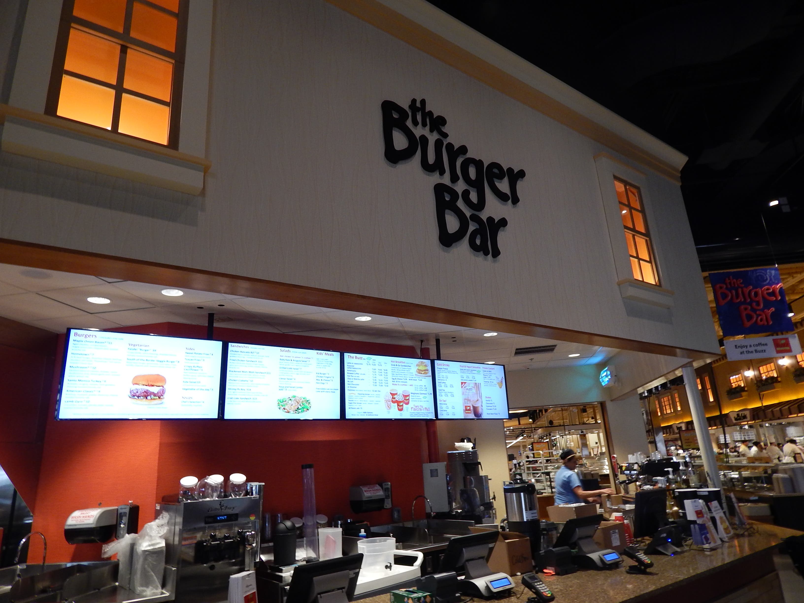 On top of traditional a grocery store, Wegmans contains Asian, veggie, organic salad, olive and homestyle food bars; a bakery; floral shop; pharmacy; pizza shop; and cafe with indoor and outdoor seating.