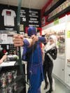 Wonder Woman, Black Cat, Daredevil and the Riddler stood on the sidewalk holding signs proclaiming "Free Comic Books!" and "Free Food" to draw crowds into Collector's Corner in celebration of Free Comic Book Day. Not that the store needs any help.