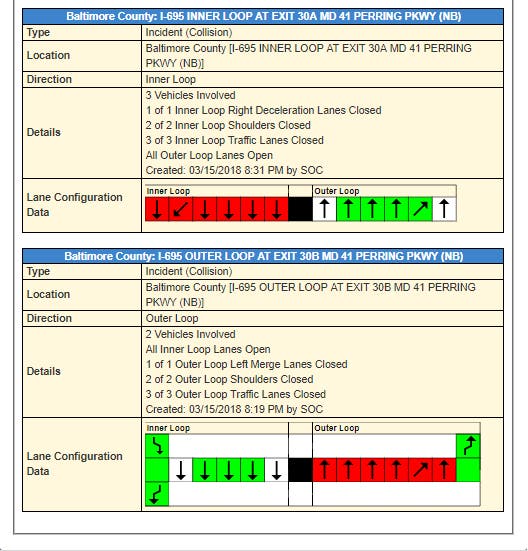 Traffic cameras in the area showed bumper-to-bumper traffic at a standstill on I-695, and drivers were advised to expect delays and take alternate routes. Backups began after 8 p.m. and had cleared by 10 p.m.