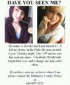 Police describe the missing girl as a white female, about 5 feet tall and 110 pounds with a thin build and a fair complexion. She has blue eyes and had black hair at the time of her disappearance, but she may be wearing a straight, brown wig. She has two tattoos—one of three bears on the right side of her ribcage and another on the inside of her right bicep. She also has two piercings, one in the right side of her lower lip and one in her nose.