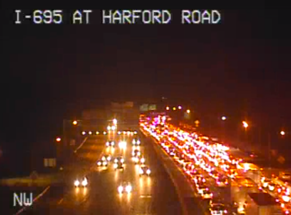 UPDATED (4:15 p.m.)—There’s a nearly 4-mile backup on the outer loop of Interstate 695 near Harford Road, according to the State Highway Administration.