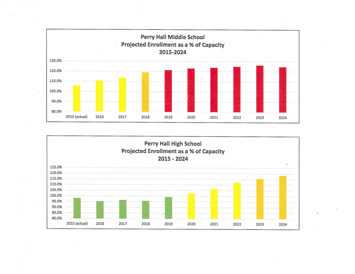 Perry Hall Middle School’s enrollment is expected to climb from 1,737 students in 2015 to 2,048 students by 2024, according to Baltimore County Public Schools projections. Put another way, the school was at 105.7 percent capacity last year, a figure that will soar to 124.7 percent in 2024.
