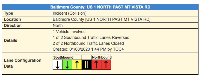 Northbound Route 1 is closed from Mount Vista Road to Sunshine Avenue, the Maryland State Highway Administration reported before 2:30 p.m.