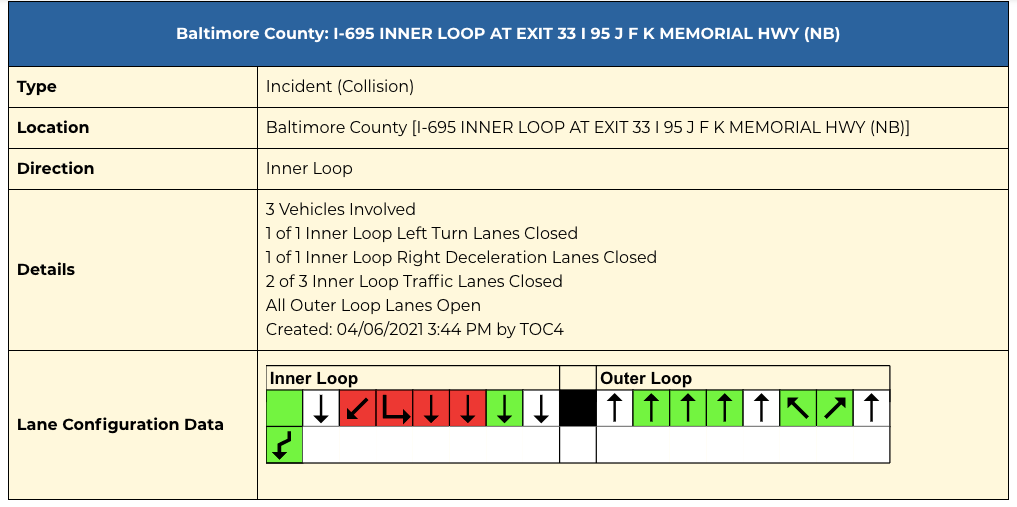 Three vehicles collided on the inner loop of the beltway at exit 33 for I-95 north, transportation officials said.