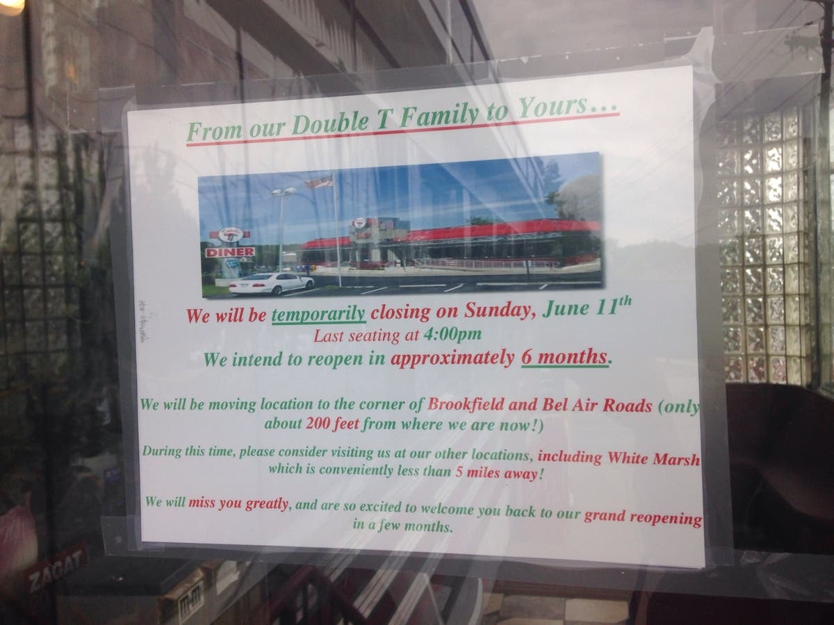 PERRY HALL, MD - The Double T Diner will be on hiatus starting in early June. The restaurant at the corner of Joppa and Ebenezer roads will close for six months as it moves 200 feet away.