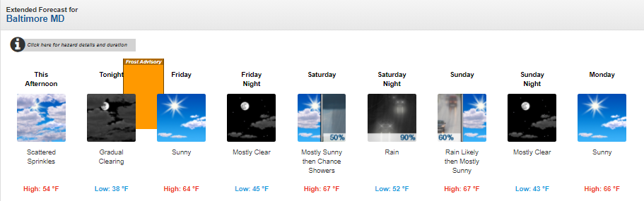 The National Weather Service issued a frost advisory for seven counties in Maryland and Baltimore City. Effective from 2 to 9 a.m. Friday, the advisory states that sensitive outdoor vegetation may be killed by frost if left uncovered.