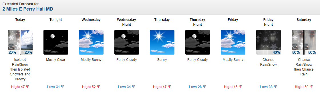 Temperatures will rise into the mid-40s in Perry Hall Tuesday, according to the forecast:
