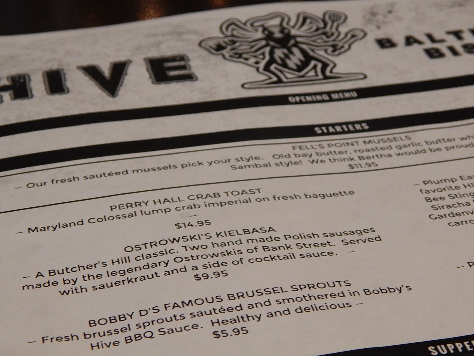 Currently, Hive is running what it calls an "opening menu," which offers starters, entrees, seafood and sandwiches. There's also a separate menu for beverages. Both food and drink are inspired by the Baltimore area.
