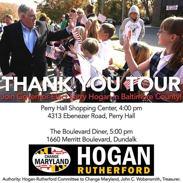 The incoming governor had penciled in Perry Hall as a stop on his thank-you tour Thursday, in an effort to show his gratitude to voters for casting their ballots last week.
