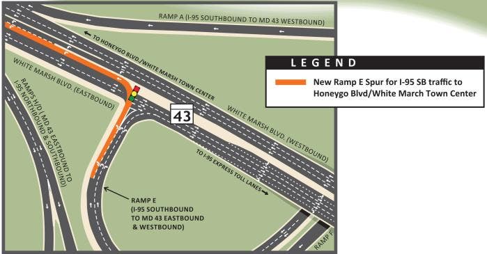 To get to Honeygo Boulevard, motorists will need to stay left at the split on exit 67 for White Marsh Boulevard/MD 43 from I-95, according to the Maryland Transportation Authority.