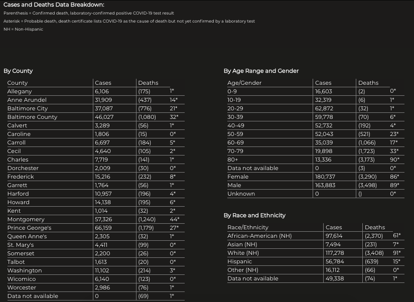 Officials say 1,080 Baltimore County residents have died from COVID-19, the disease caused by the coronavirus, an increase of six in the last day. More than 6,700 Marylanders have died from the virus since the beginning of the pandemic, according to the Maryland Department of Health.