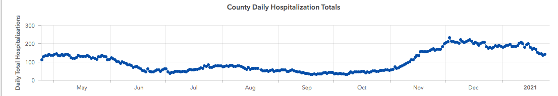 In Baltimore County, coronavirus-related hospitalizations are also on a downward trend. They had 140 patients hospitalized with the virus as of Sunday, Jan. 24, the latest data available. There were 206 coronavirus patients in Baltimore County hospitals as of Jan. 11, according to the data.