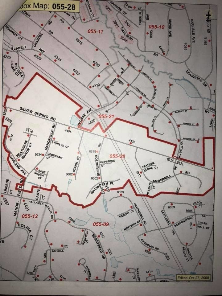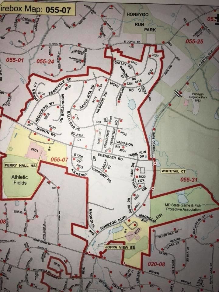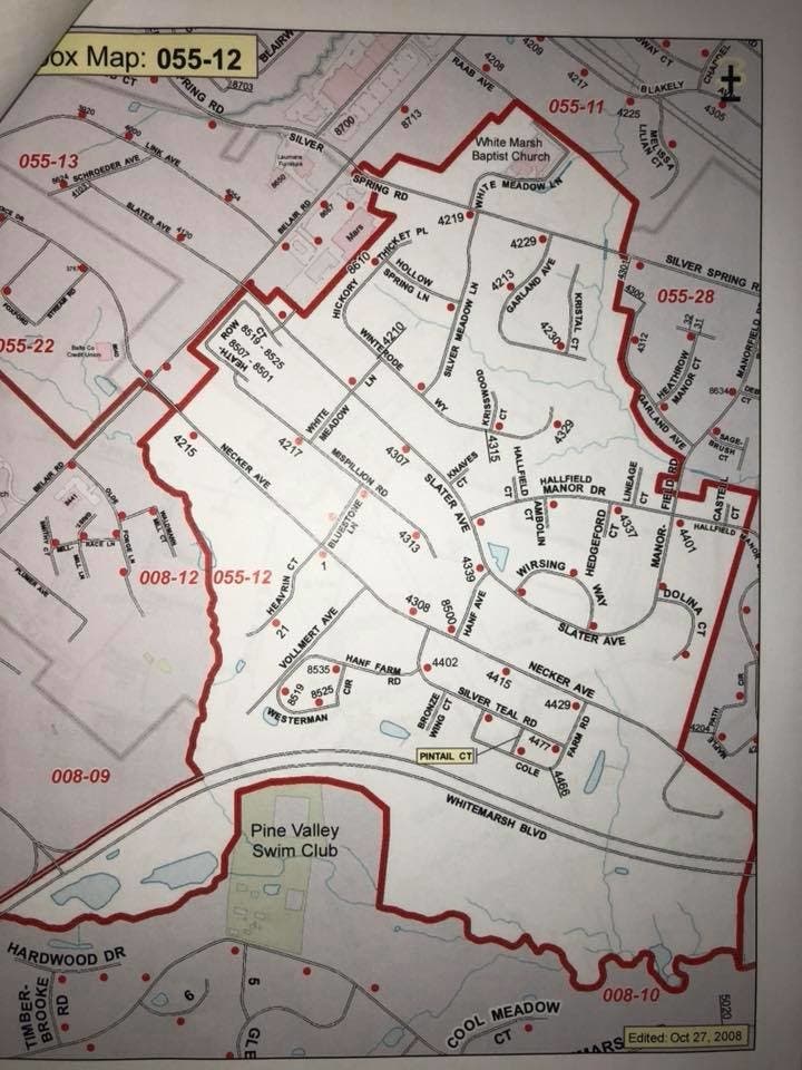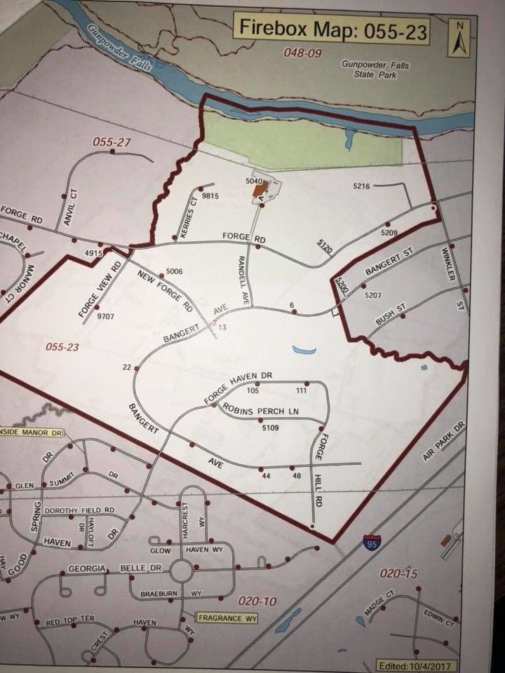 - Miller Road to Gunridge Circle to Foxhill Road to Meeting House Road to Marilynn Road to Perry Hall Road to Perry Land Court to Kraft Hill Road to Schroeder Avenue to Adams Way to Flintlock Court to Colenbourne Road to Gunview Farm Court to Powder Farm Court to Forge Road to Jordan Way to Kyle Creek Court to Gunforge Road to Carlyn Road to Forge Park Road to Piney Park Road to Falls View Court to Falls Park View Court to Falls Park Road to Richlyn Drive to Forge Valley Court