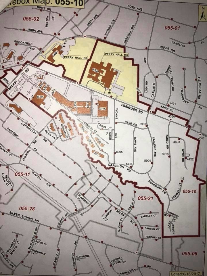 - Franklinville Road to Chapman Road to Redstone Road to Caspian Road to Bluestone Road to Yellowstone Road to Hammond Glen Court to Cedar Lane to Cross Road to Hillside Road to Jerusalem Road to Jerusalem Glen Court to Glenbauer Road to Jerusalem Mill Court to Celabrie Court to Kings Glen Court to Darney Court to Buckhill Road