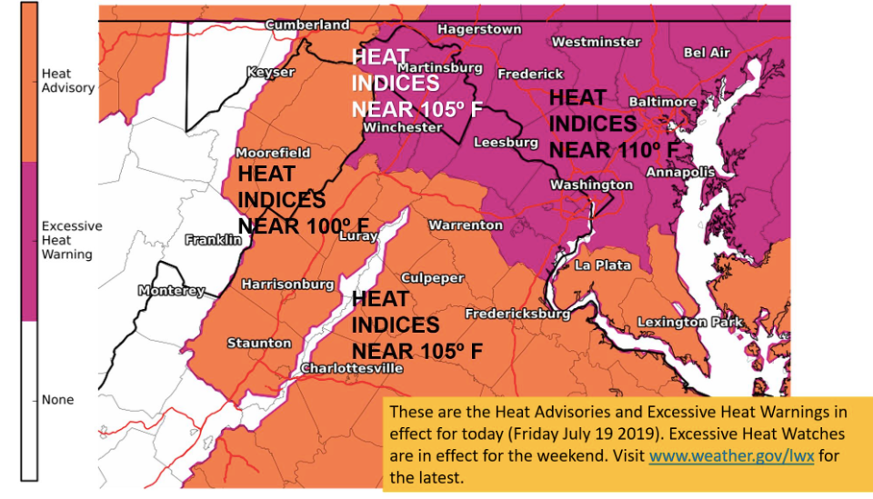 An excessive heat warning is in effect from 11 a.m. to 9 p.m. on Friday, July 19. It applies to most of Maryland, including Baltimore County.