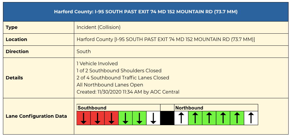The collision occurred on I-95 south past the exit for MD 152/Mountain Road around 11:30 a.m., according to state transportation officials.