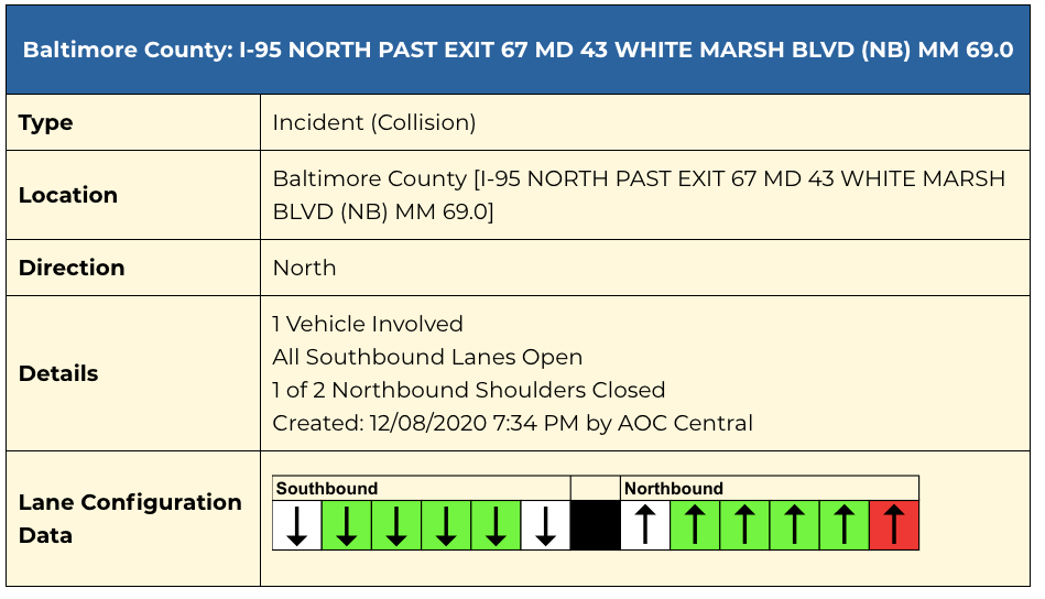 Firefighters and medics were called to I-95 north near mile marker 69, the White Marsh Volunteer Fire Company reported around 7:30 p.m.