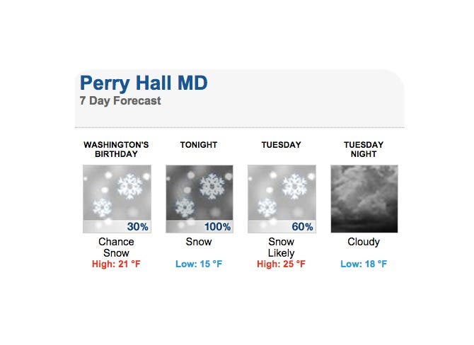 Perry Hall is under a winter storm warning from 6 p.m. Monday to noon Tuesday, according to the National Weather Service.
