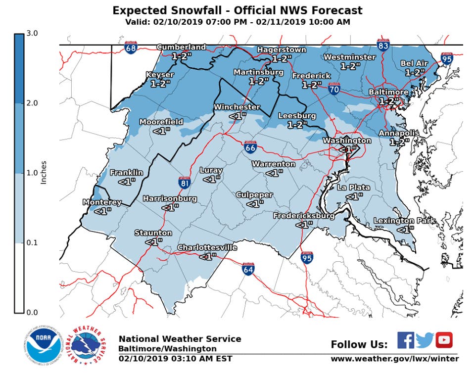 About 1 to 2 inches of snow and less than 0.1 inch ice are expected in central, northern and western Maryland Sunday night to Monday morning, according to the winter weather advisory.