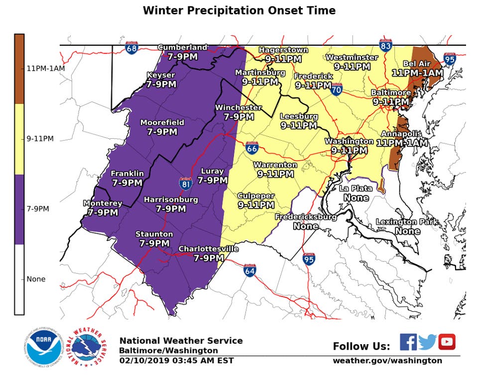 Baltimore City and Allegany, Anne Arundel, Baltimore, Carroll, Frederick, Harford, Howard and Montgomery counties are under this advisory, effective from 7 p.m. on Sunday, Feb. 10, to 10 a.m. on Monday, Feb. 11.
