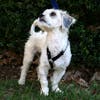 BART (all-white poodle-mix) — Bart is the more energetic and adventurous of the two pups, but also very snuggly and loves to give kisses. His foster mom calls him the “glue dog” because he follows her around everywhere and wants to be by her side. He craves attention and bonds quickly to anyone who holds and pets him. He loves to play fetch and carries his squeaky alligator toy around with him everywhere—he even tries to take it out on walks with him. It may be the first toy he’s ever had, and he is attached to it.