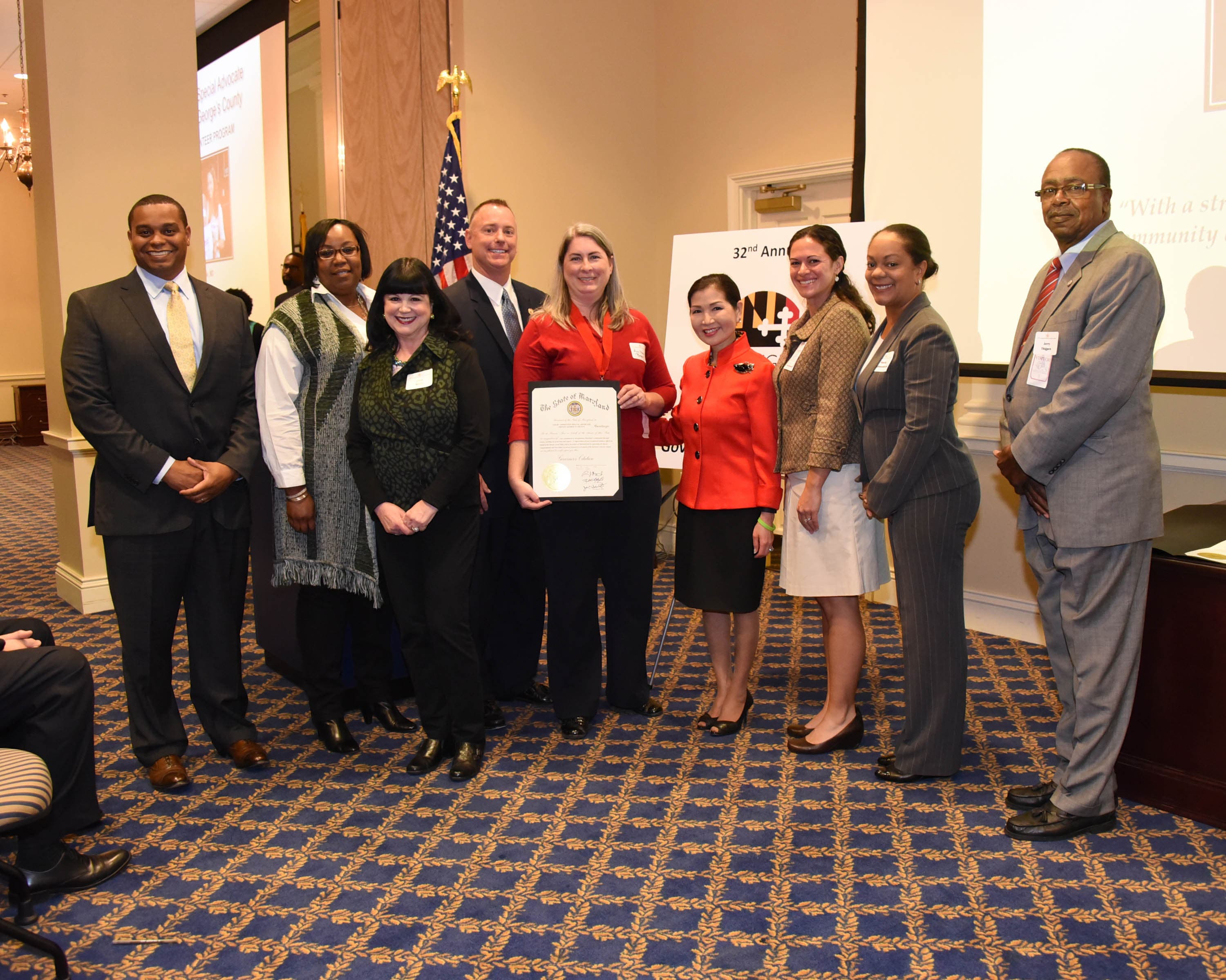 Yesterday in Annapolis Court Appointed Special Advocate (CASA)/Prince George’s County received the Governor’s Service Award for Nonprofit Program, presented by Maryland’s 1st Lady, Mrs. Yumi Hogan and Steve McAdams from the Governor’s Office of Community Initiatives. The Governor’s Service Awards recognize significant contributions and sustained commitment to meeting Maryland’s most pressing needs. CASA was nominated as a representative of outstanding volunteer service and was selected by a committee of community leaders, volunteers and State staff.