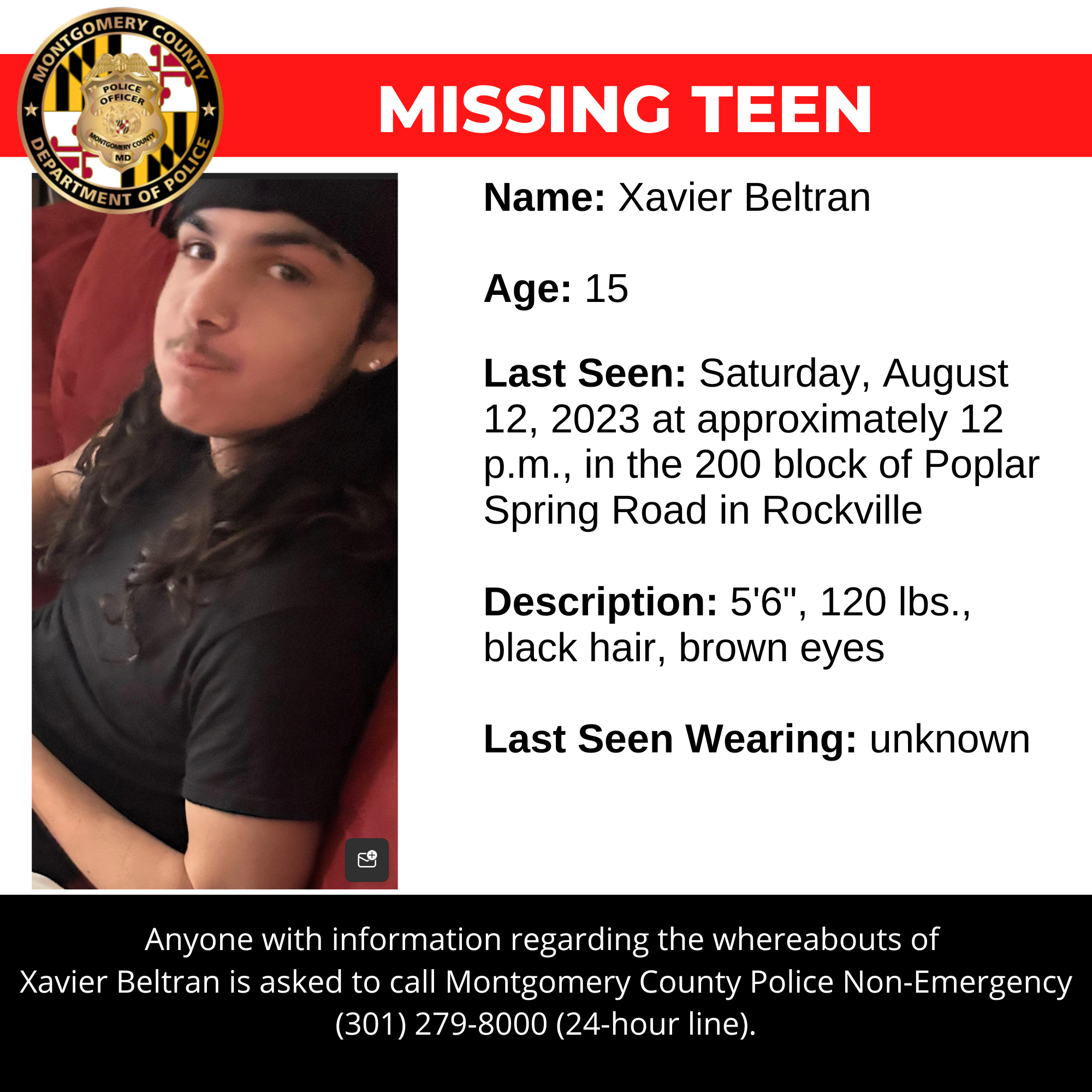 Xavier Beltran as last seen Aug. 12 around 12 p.m., in the 200 block of Poplar Spring Road in Rockville.