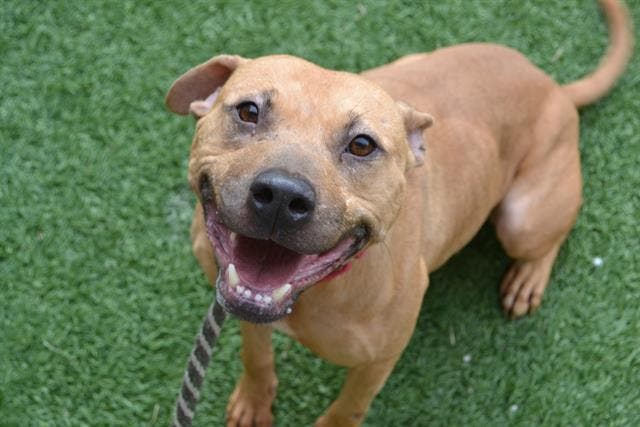 Sex, Breed: Spayed female, brown Black Mouth Cur and American Pit Bull Terrier.