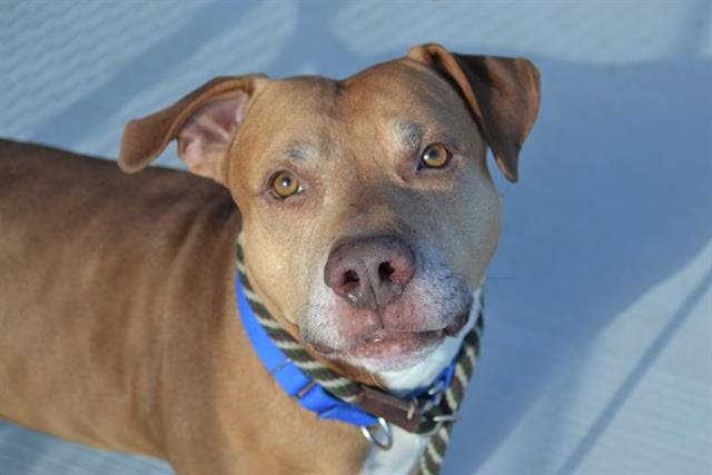 Sex, Breed: Neutered male, brown Staffordshire Bull Terrier.
