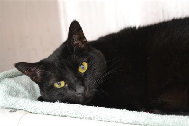 Sex, Breed: Spayed female, black Domestic Shorthair.